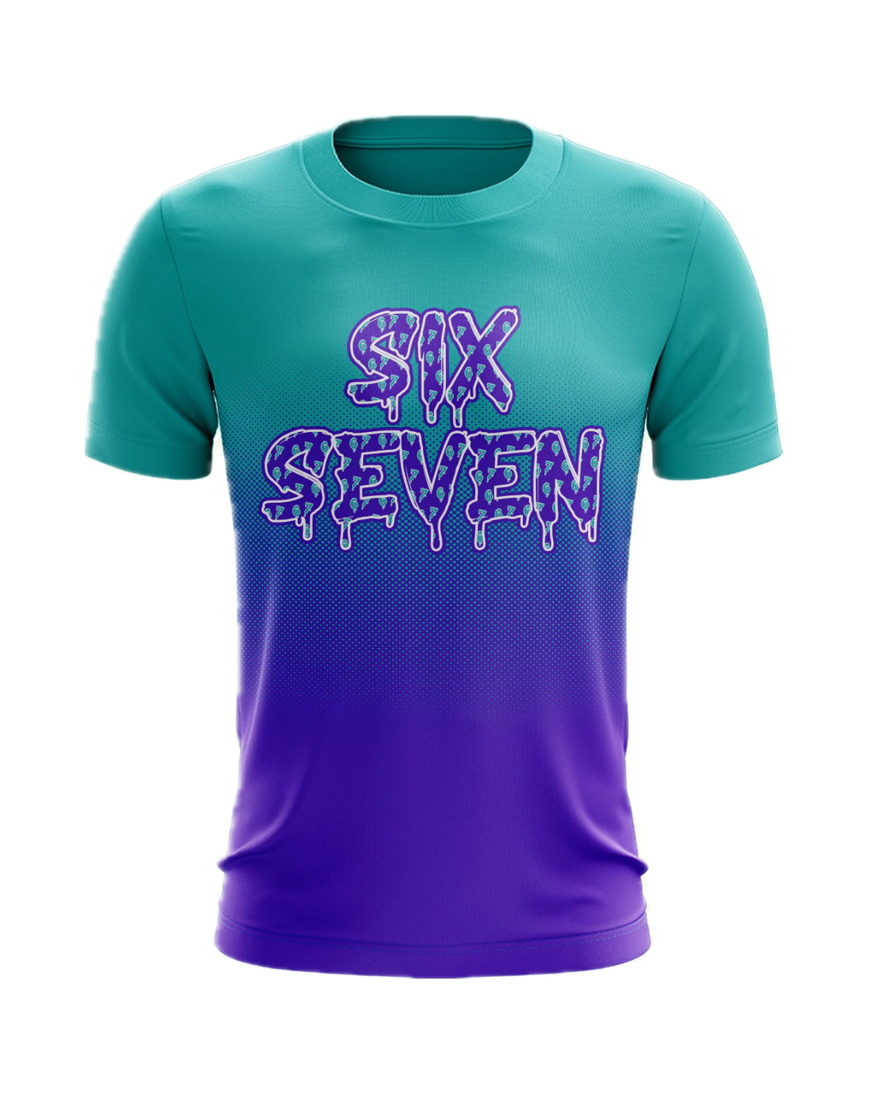 Make a statement with the 67 drip shirt. Teal to purple ombre featuring SIX SEVEN across the chest in drip font and repeating 67s in the letters.